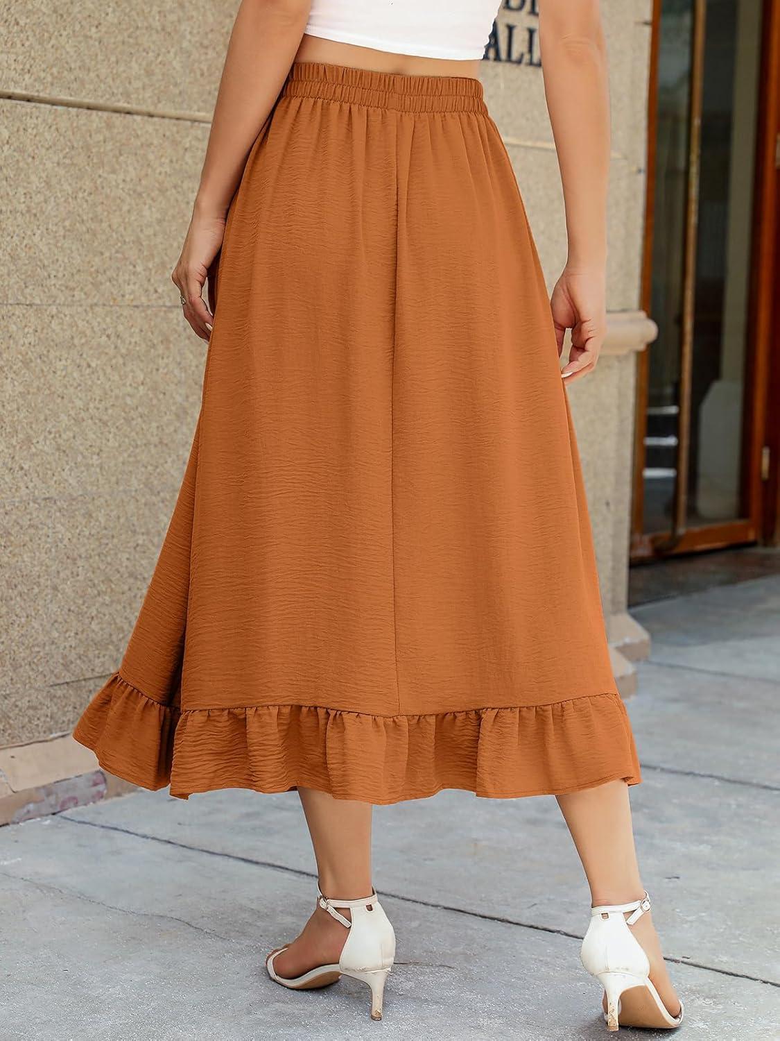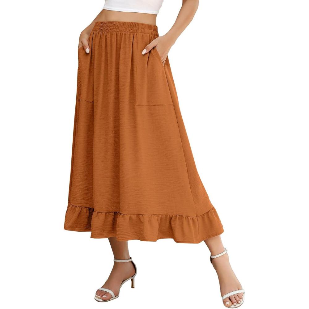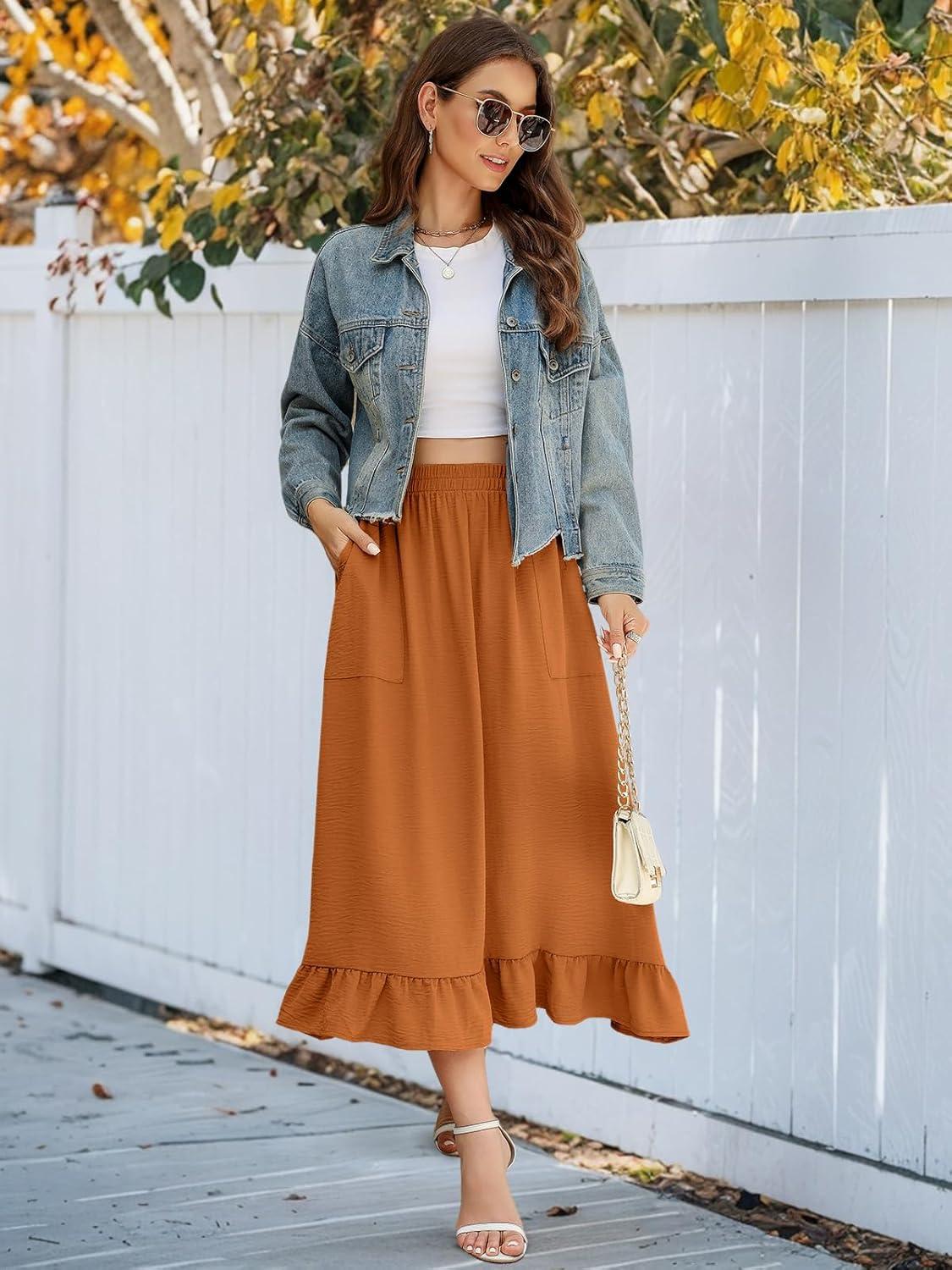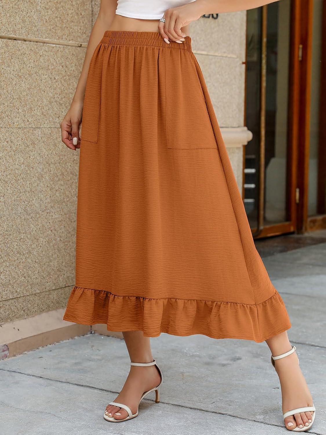 imageBerydress Womens Midi Skirts with Pockets Elastic High Waist Flowy Swing A Line Casual Tiered Ruffle SkirtOrange