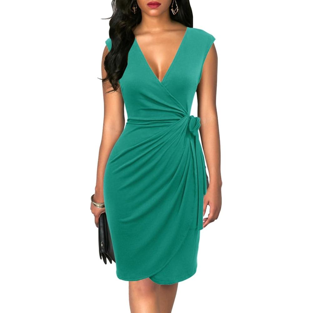 Berydress Women’s Vintage V-Neck Sheath Casual Party Work Faux Black Wrap Dress(Turquoise)