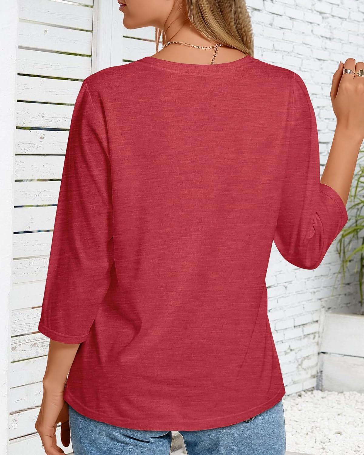 CHICGAL Women 3/4 Sleeve Shirts Casual Round Neck Tops Basic Tees Cute T-Shirts Blouses(B Red)