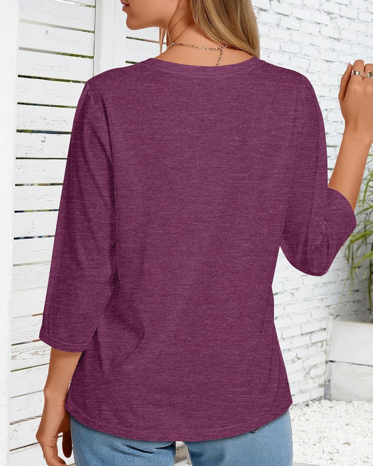CHICGAL Women 3/4 Sleeve Shirts Casual Round Neck Tops Basic Tees Cute T-Shirts Blouses(B Wine Red)