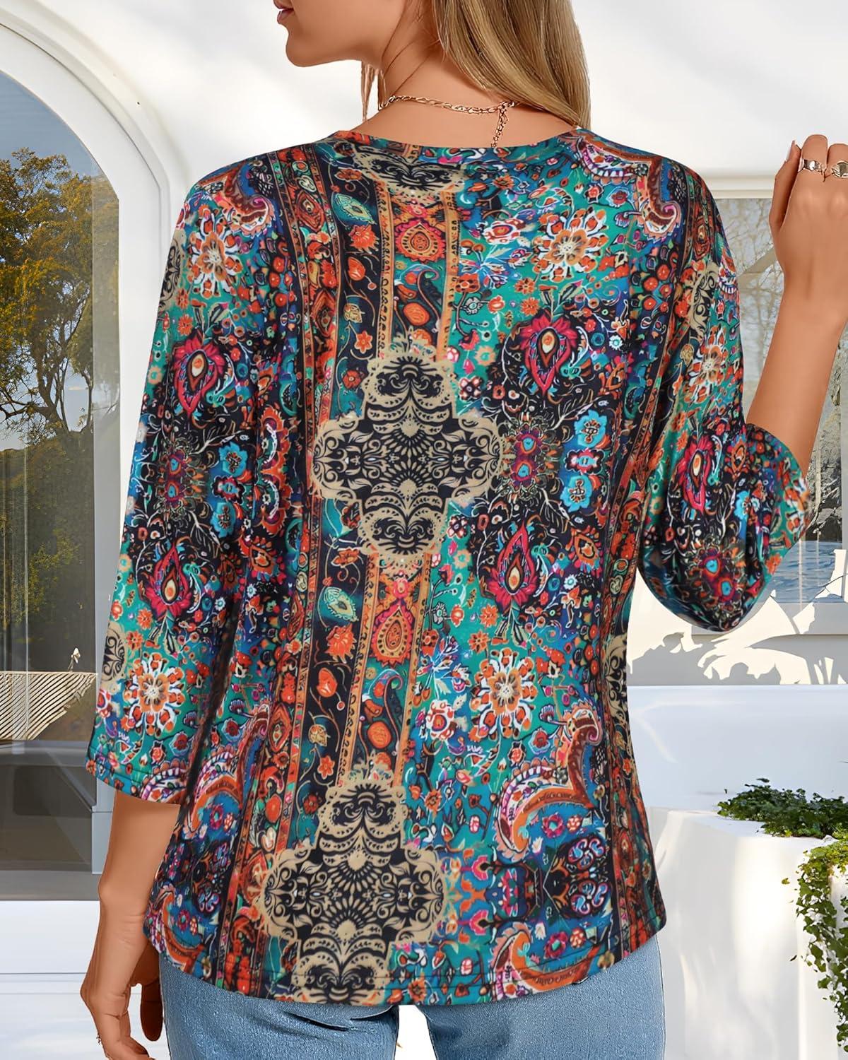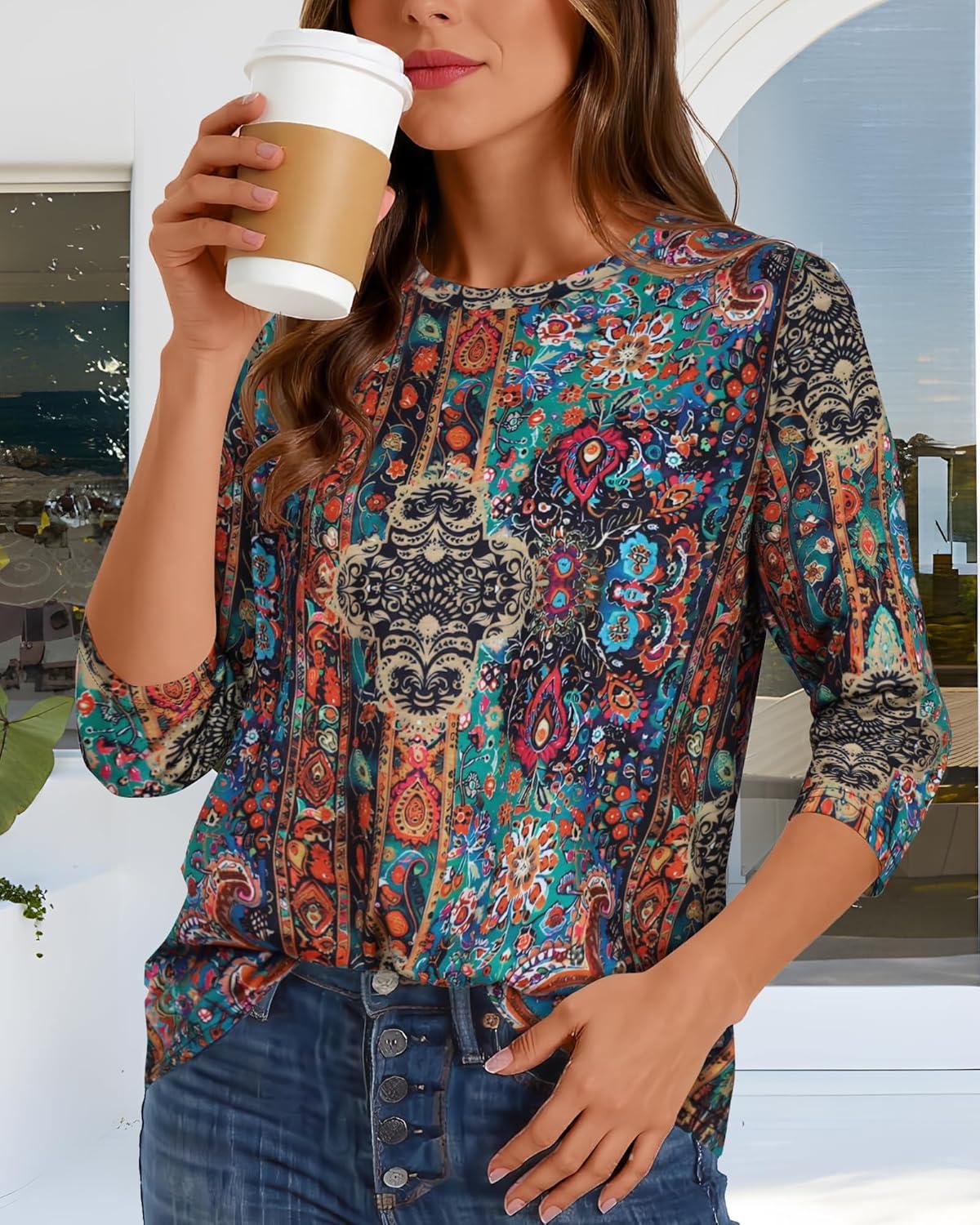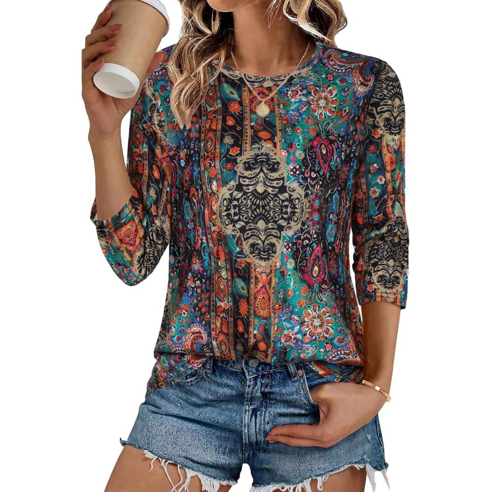 CHICGAL Women 3/4 Sleeve Shirts Casual Round Neck Tops Basic Tees Cute T-Shirts Blouses(Bohemian Print)