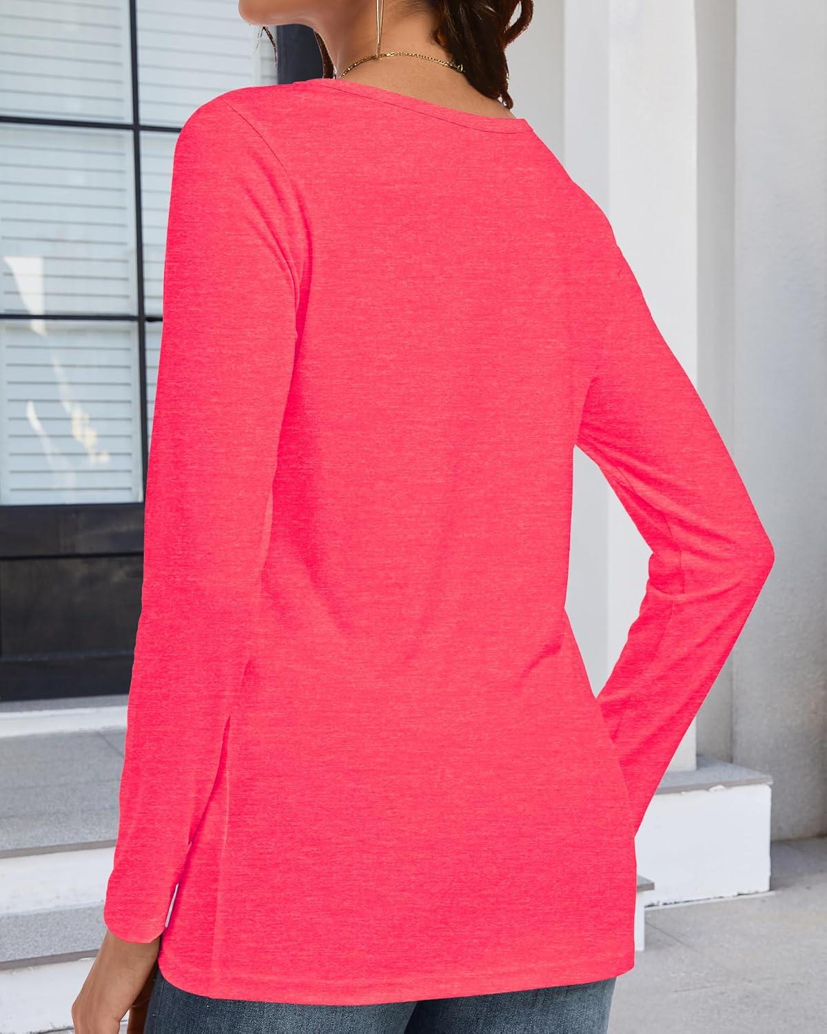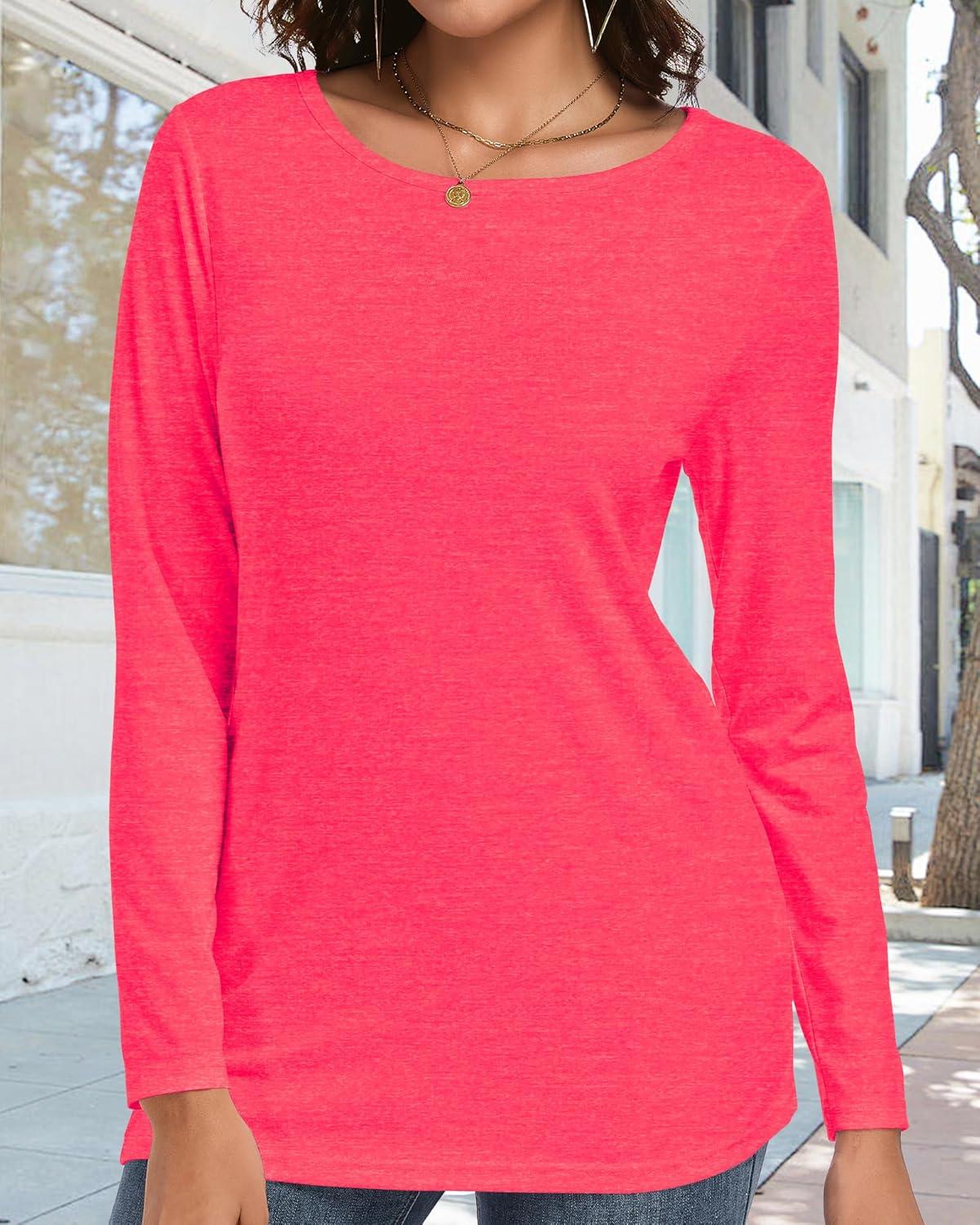 CHICGAL Women Long Sleeve Shirts Casual Fall Tees Crew Neck Basic Tunic Tops(Bright Pink)