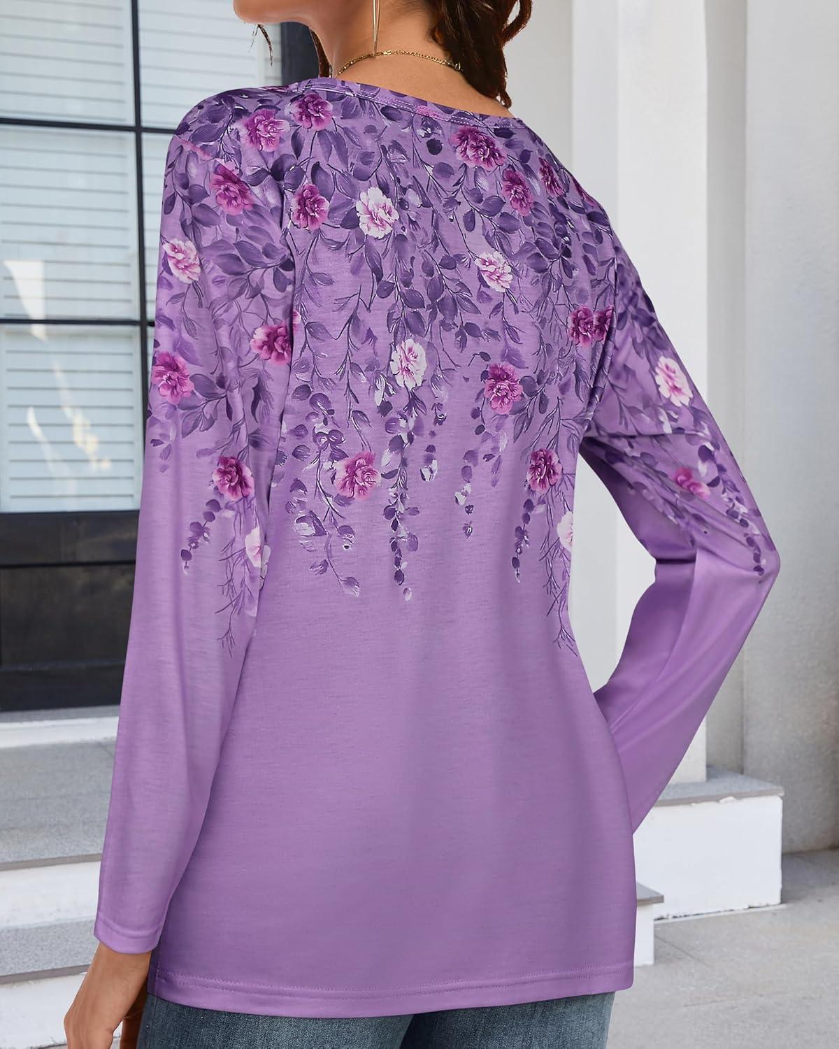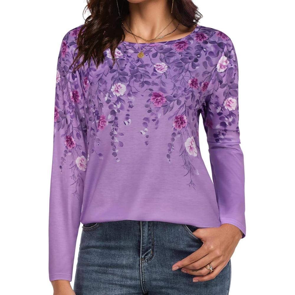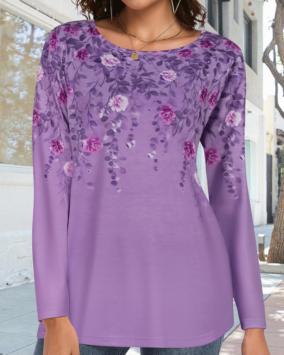CHICGAL Women Long Sleeve Shirts Casual Fall Tees Crew Neck Basic Tunic Tops(Purple Floral)