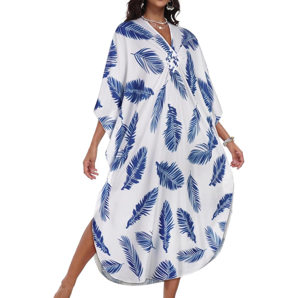 CHICGAL Womens Kaftan Dresses Long Caftans Plus Size Batwing Sleeve Swimsuit Coverup V Neck Summer Beach Dress(Blue Feather Leaves)