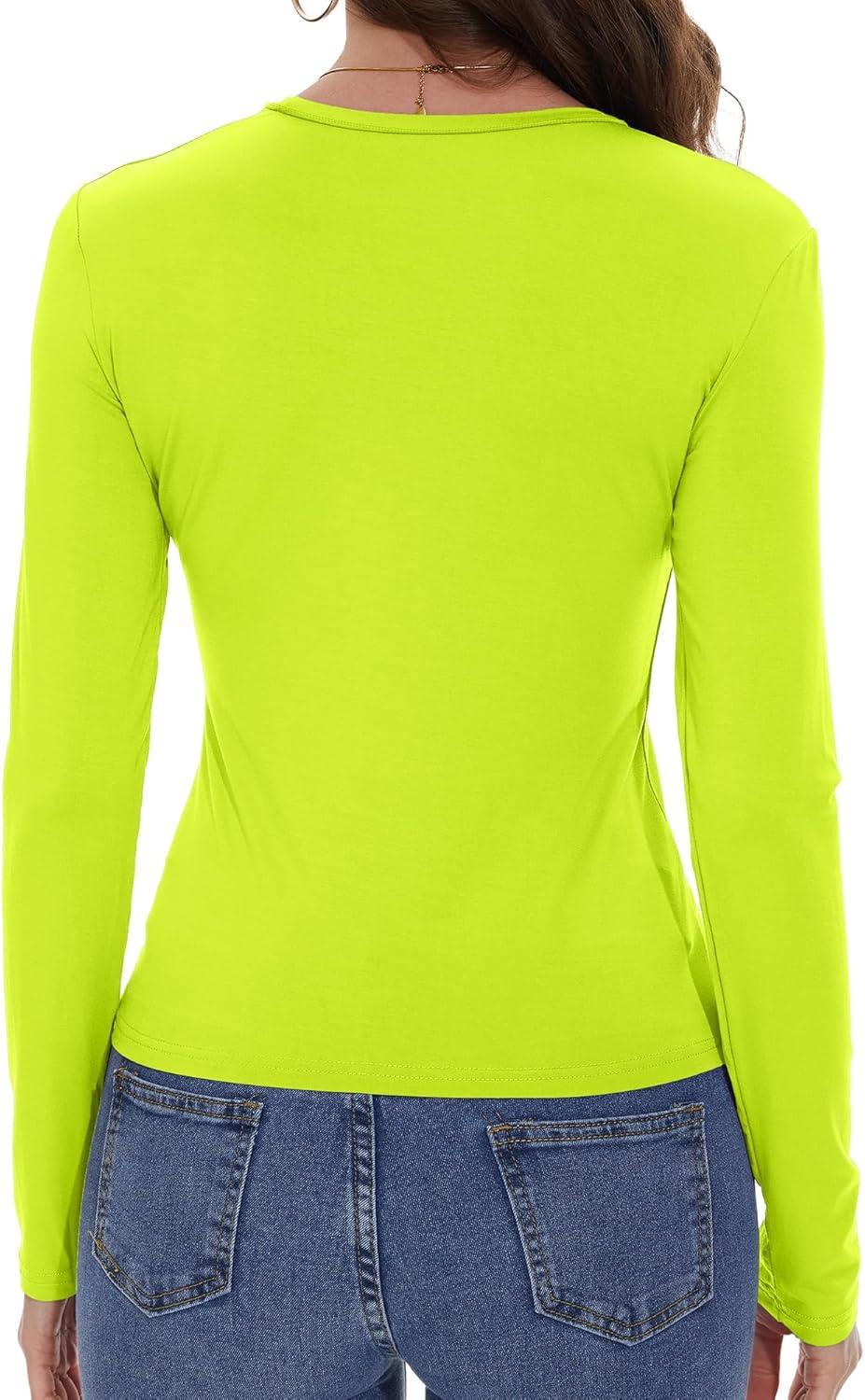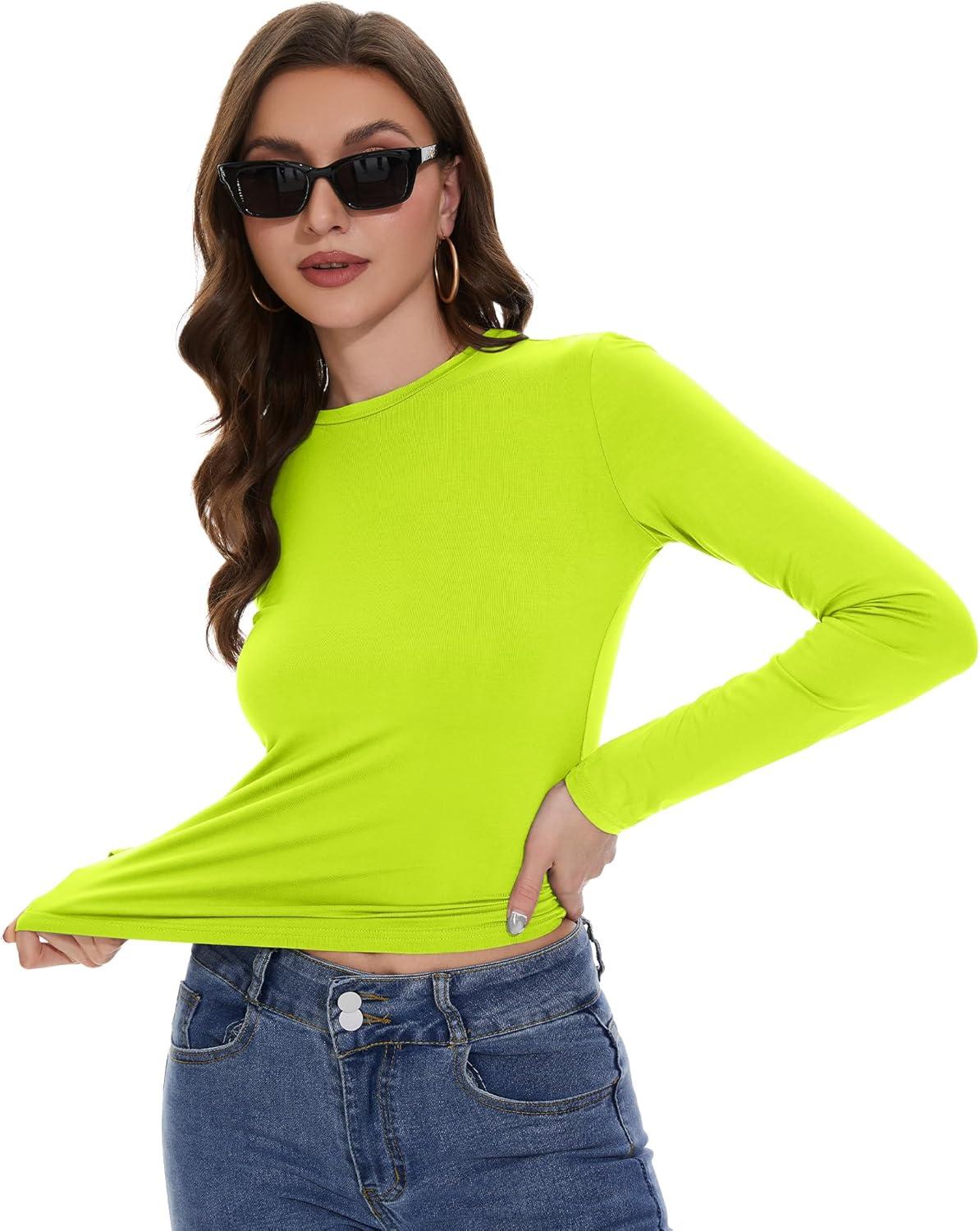 Womens Long Sleeve Shirts Basic Tees Y2k Slim Fit T Shirt Crew Neck Trendy Crop Top Casual(02#neon Green)