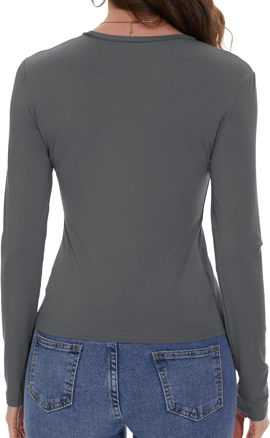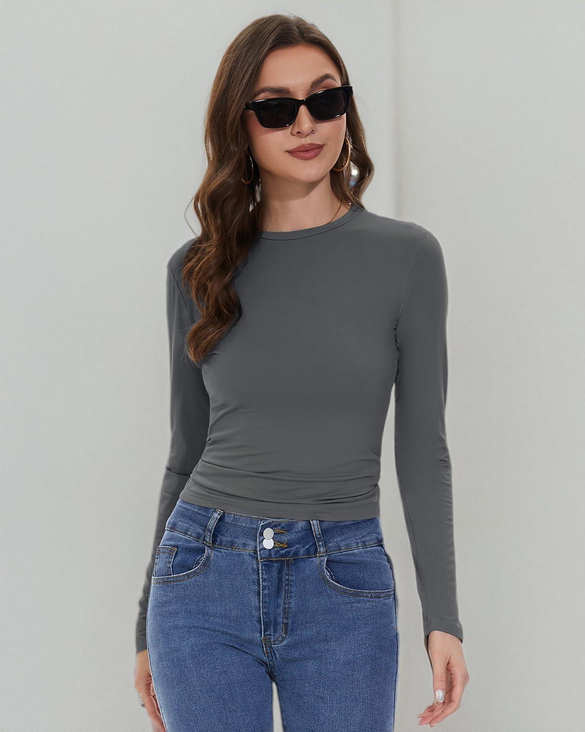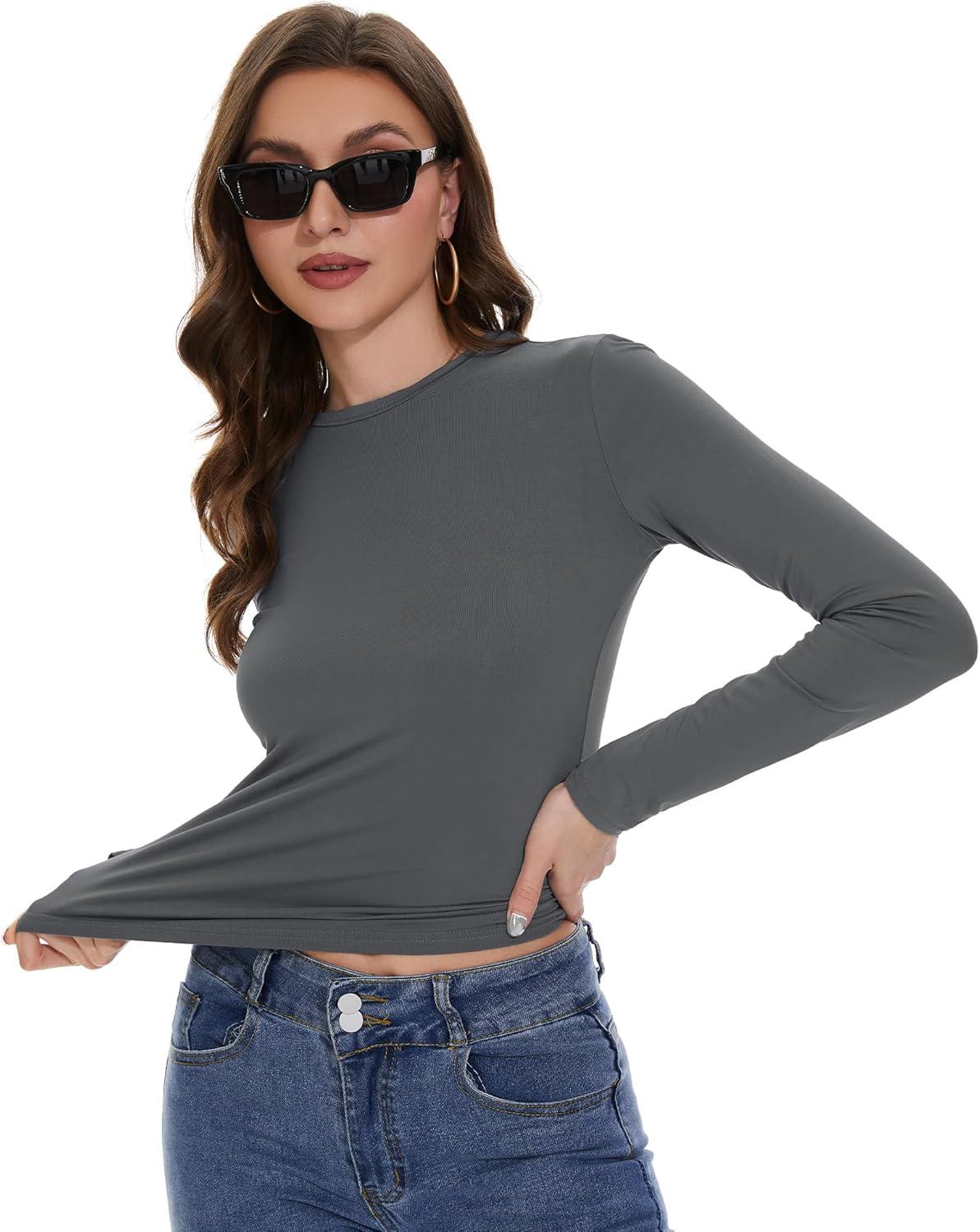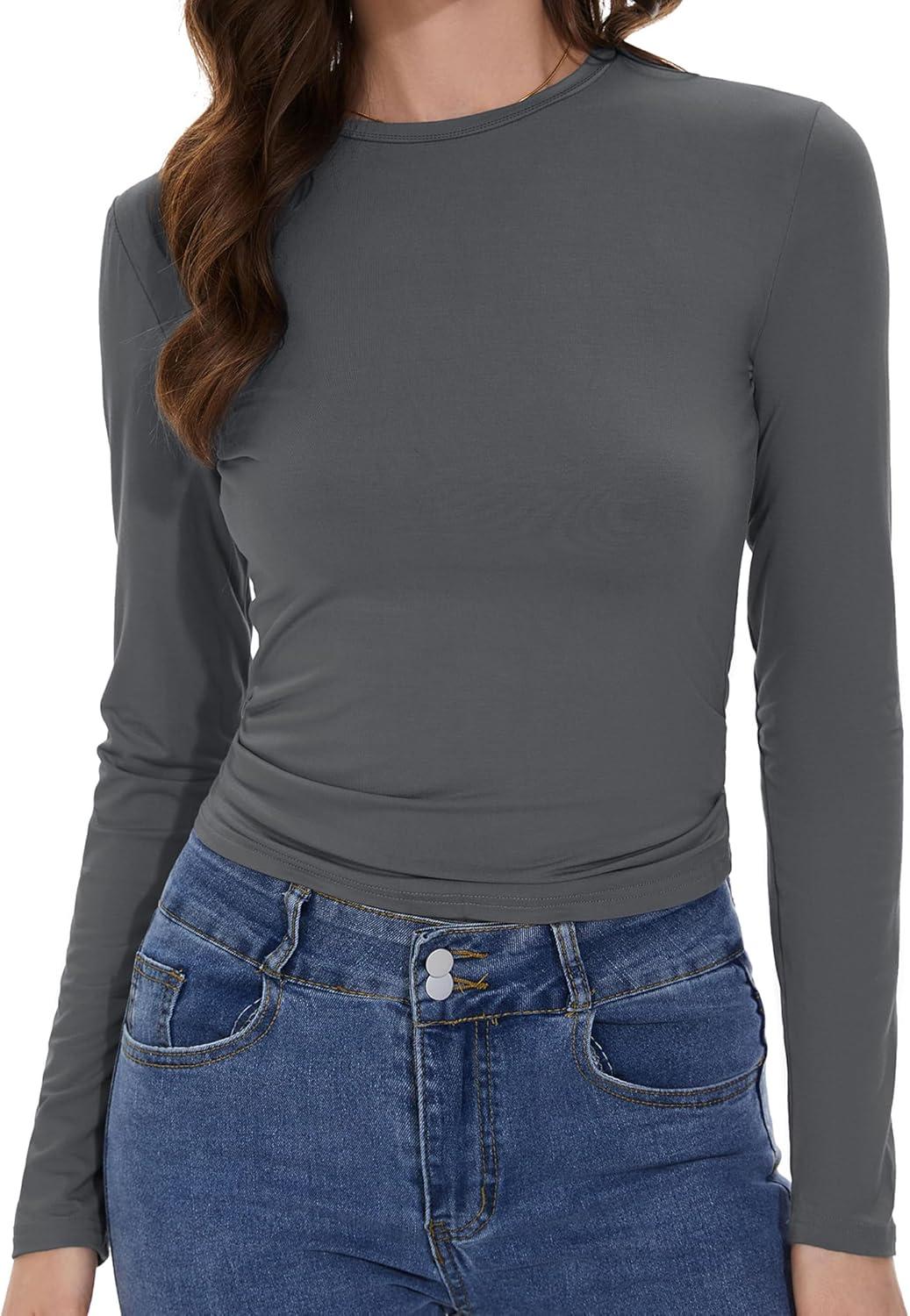 Womens Long Sleeve Shirts Basic Tees Y2k Slim Fit T Shirt Crew Neck Trendy Crop Top Casual(03#deep Grey)