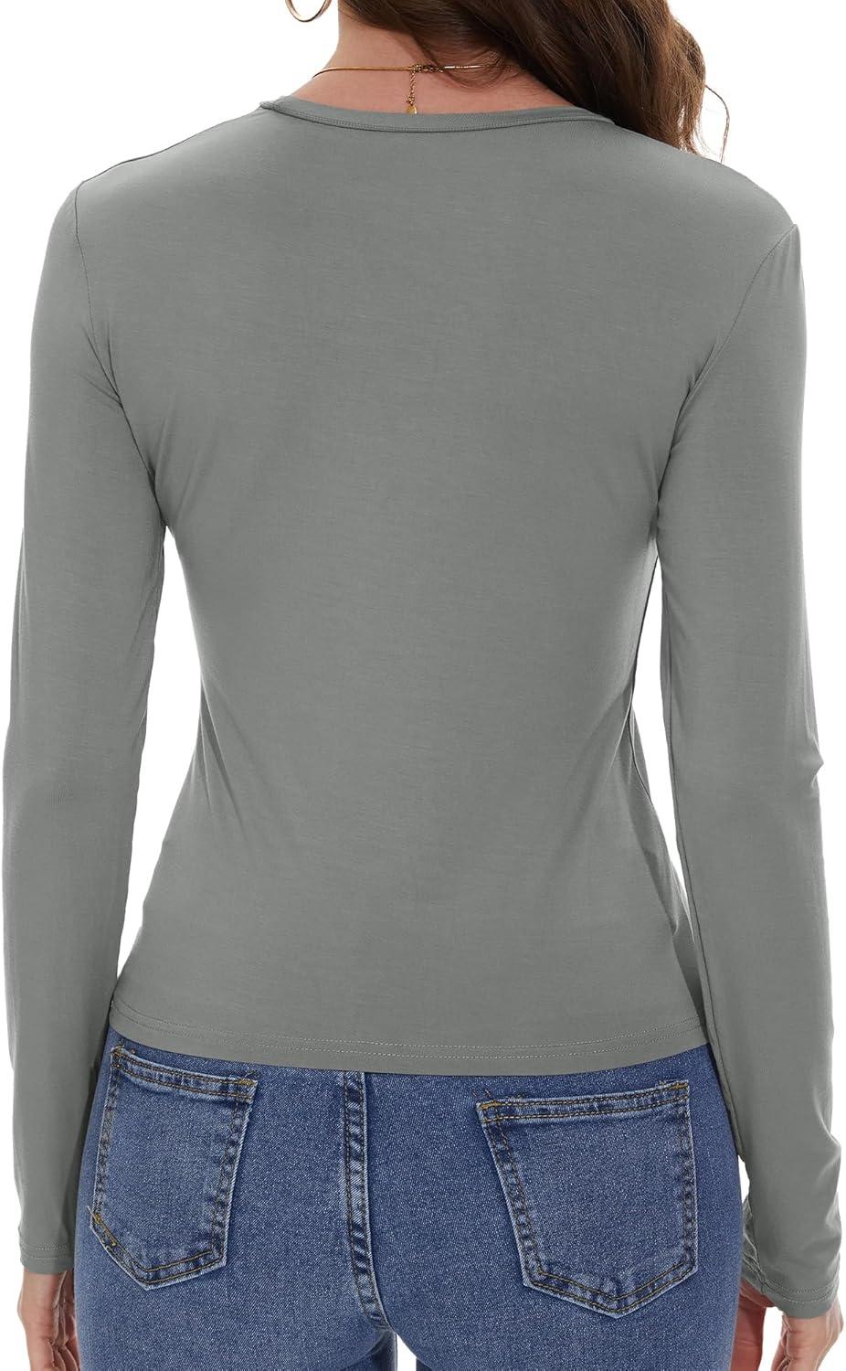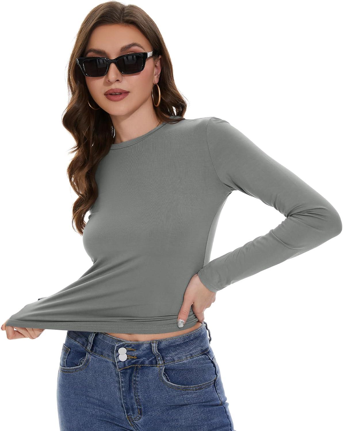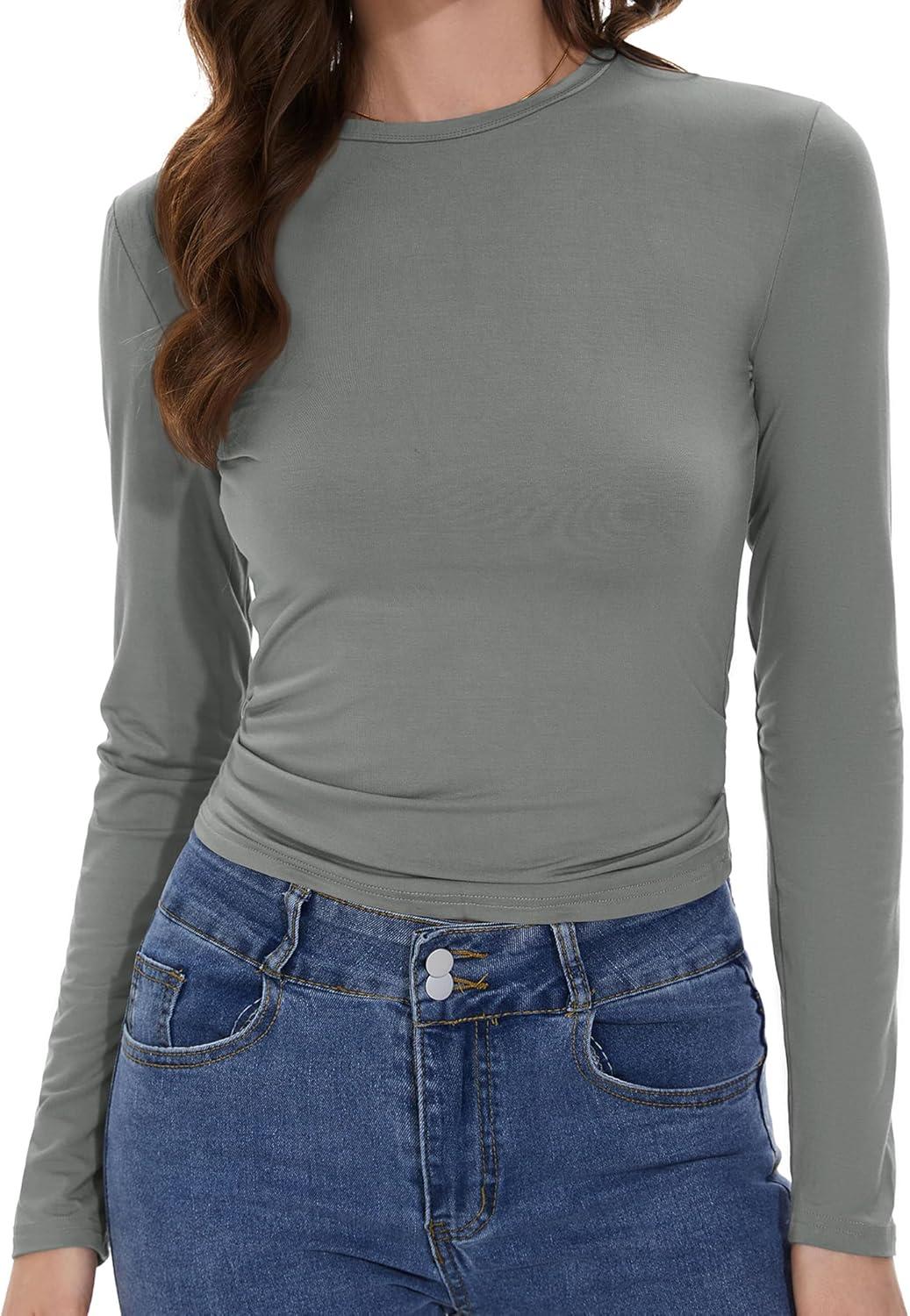 Womens Long Sleeve Shirts Basic Tees Y2k Slim Fit T Shirt Crew Neck Trendy Crop Top Casual(03#light Grey)