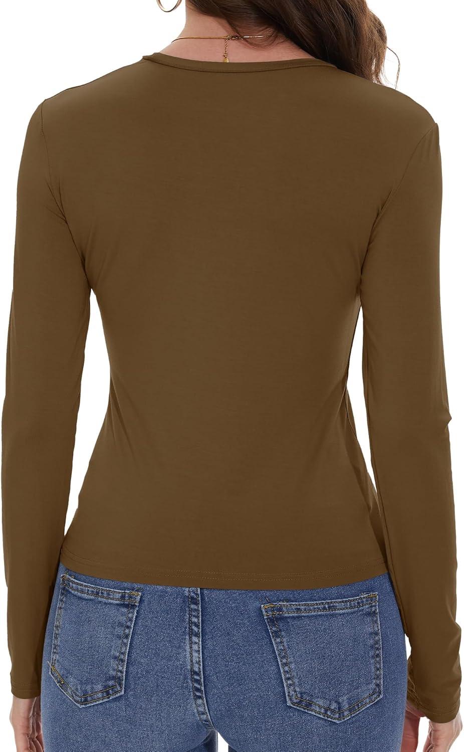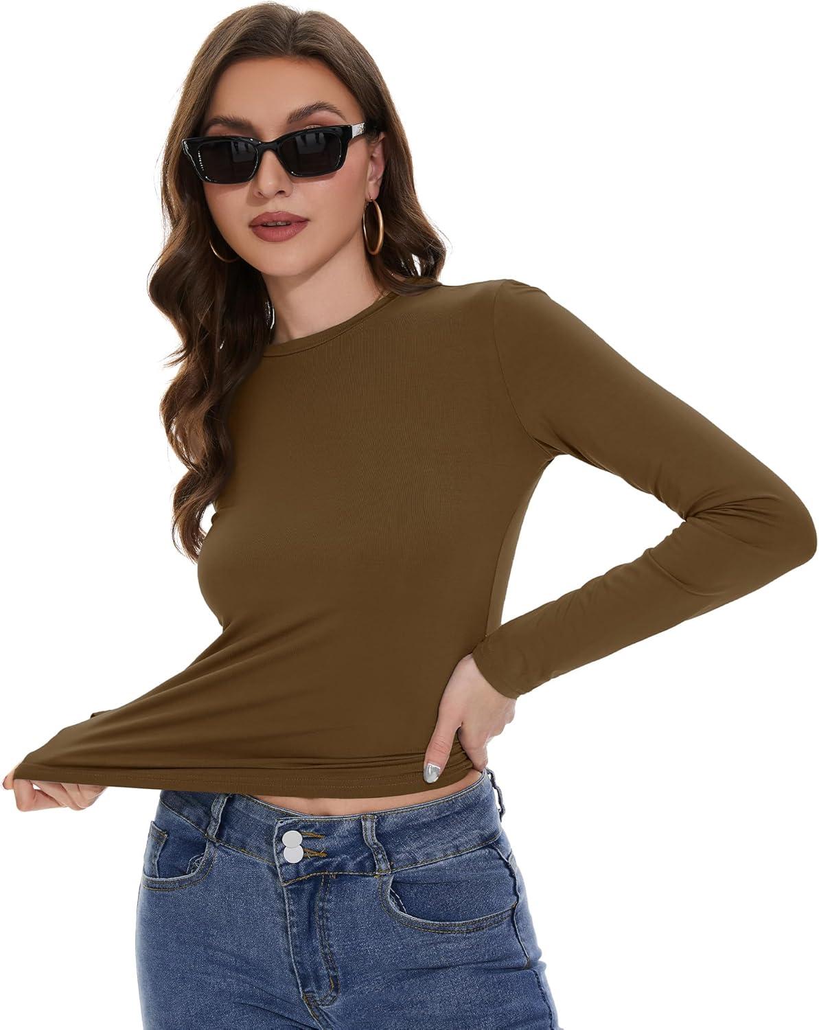 Womens Long Sleeve Shirts Basic Tees Y2k Slim Fit T Shirt Crew Neck Trendy Crop Top Casual(04#coffee)