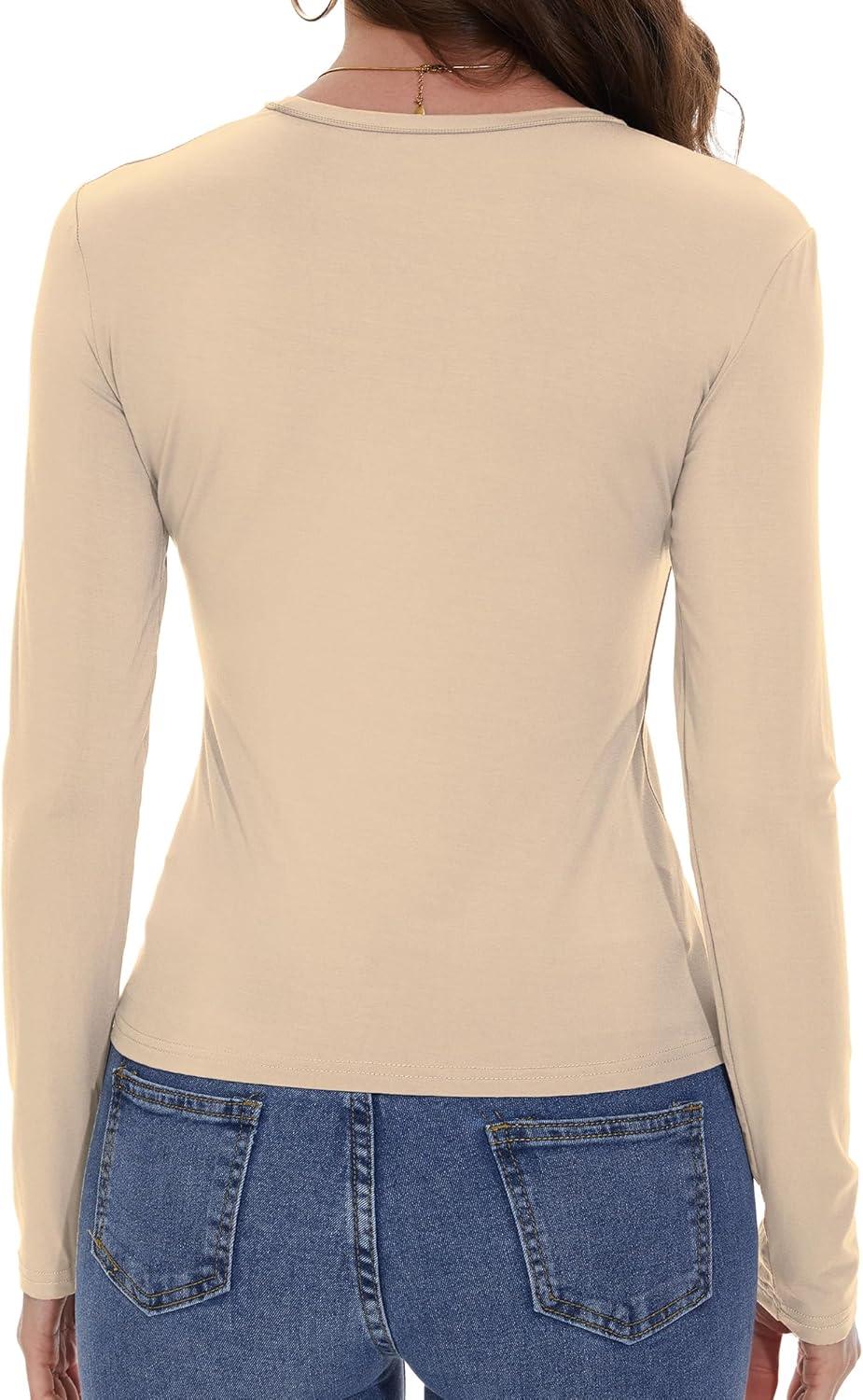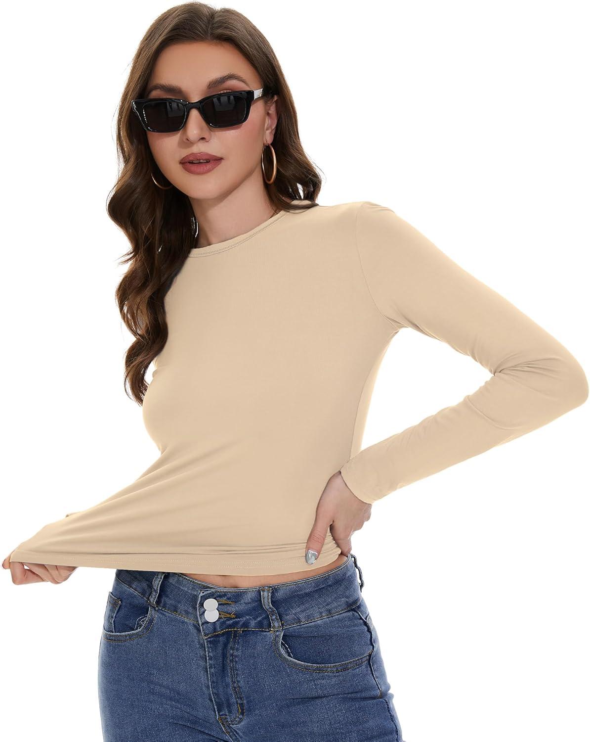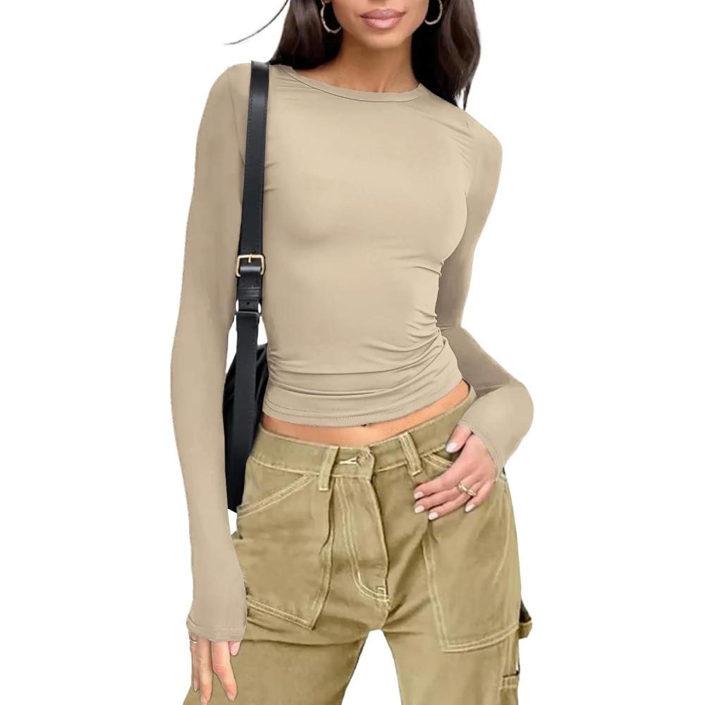 Womens Long Sleeve Shirts Basic Tees Y2k Slim Fit T Shirt Crew Neck Trendy Crop Top Casual(04#khaki)